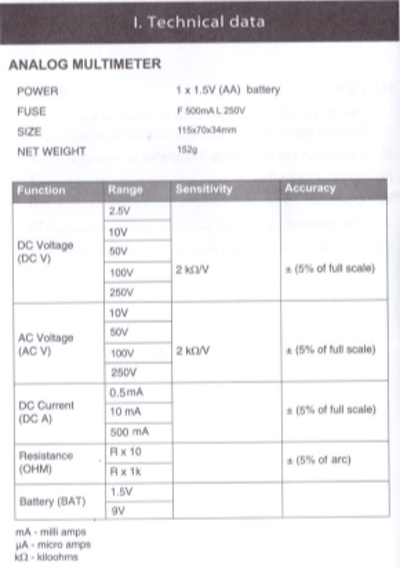 This is an scan of the specifications page of the All-Sun pocket multimeter sold at Canadian Tire. It appears to be a All-Sun EM330B. The sensitivity value for this meter is 2k-ohm per volt for AC and DC voltage measurements.